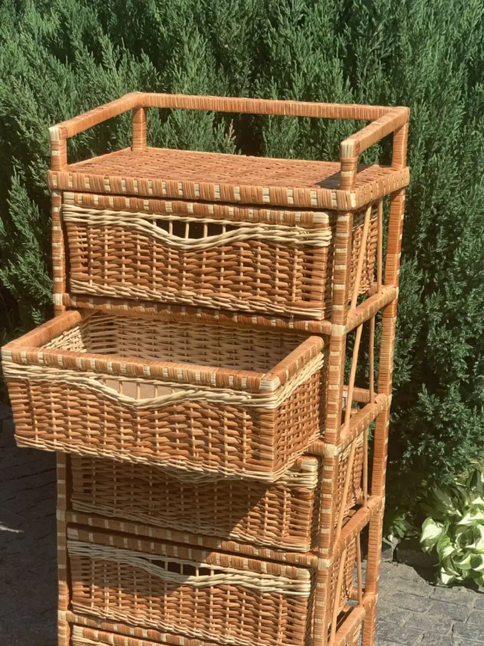 A beautifully handwoven wicker chest of drawers, crafted from natural, eco-friendly rattan. This piece combines timeless craftsmanship with elegant design, adding texture and rustic charm to any interior. Its durable construction and artisanal weaving make it both functional and decorative, a versatile addition to enhance the warmth and character of your home.